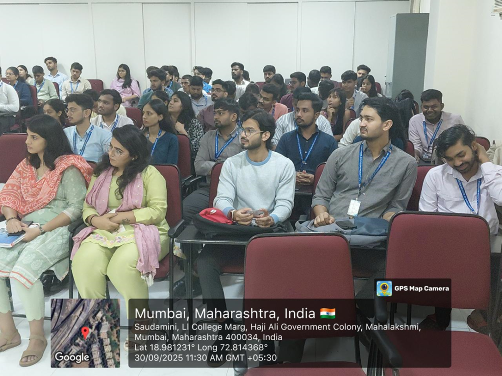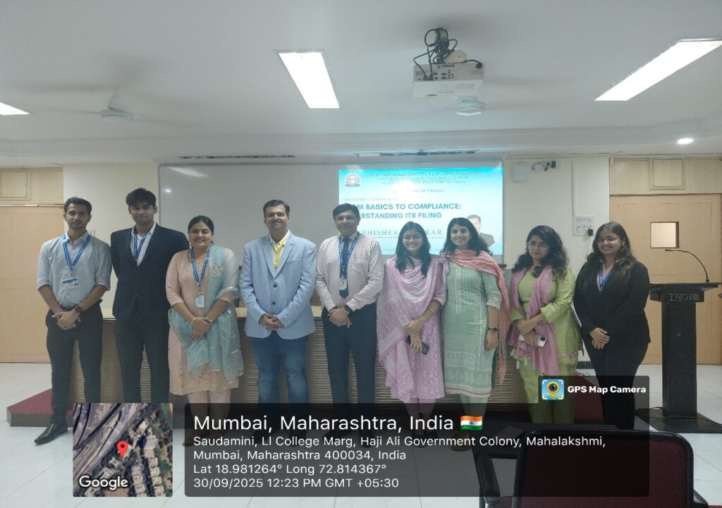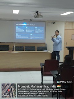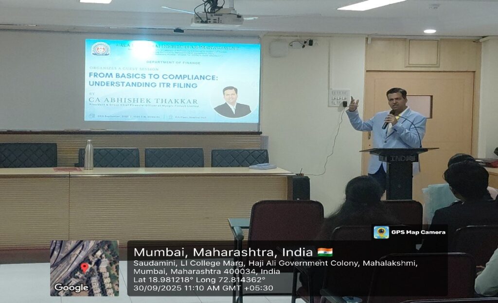 A guest session titled “Understanding ITR Filings – From Basics to Compliance” was organised on 30th September 2025 from 11.00 a.m. to 12.00 p.m. The resource person of the session was CA Abhishek Thakkar, President and Group CFO at Niyogin Fintech Limited. The session provided students with a clear understanding of the fundamentals of Income Tax Return filing, compliance requirements, and common mistakes to avoid. Practical insights and real-life examples helped students appreciate the importance of timely and accurate tax compliance in professional practice.